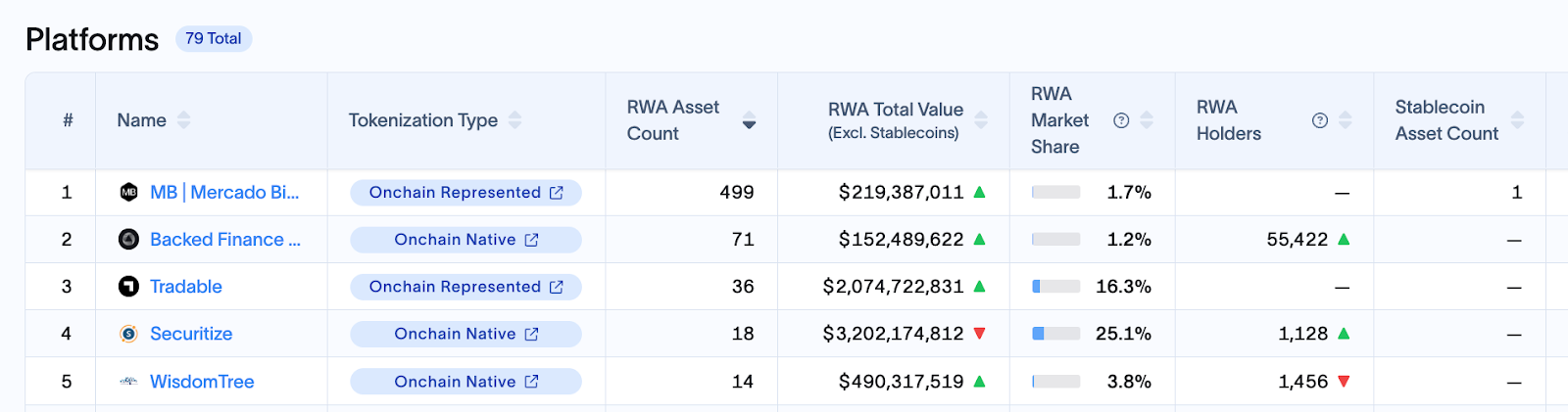 According to RWA.xyz dashboard, Backed Finance holds the second position in total RWA asset count with 71 tokenized assets, trailing Mercado Bitcoin (499 assets). However, it ranks 15th in both total RWA value ($152M) and market share (1.2%).