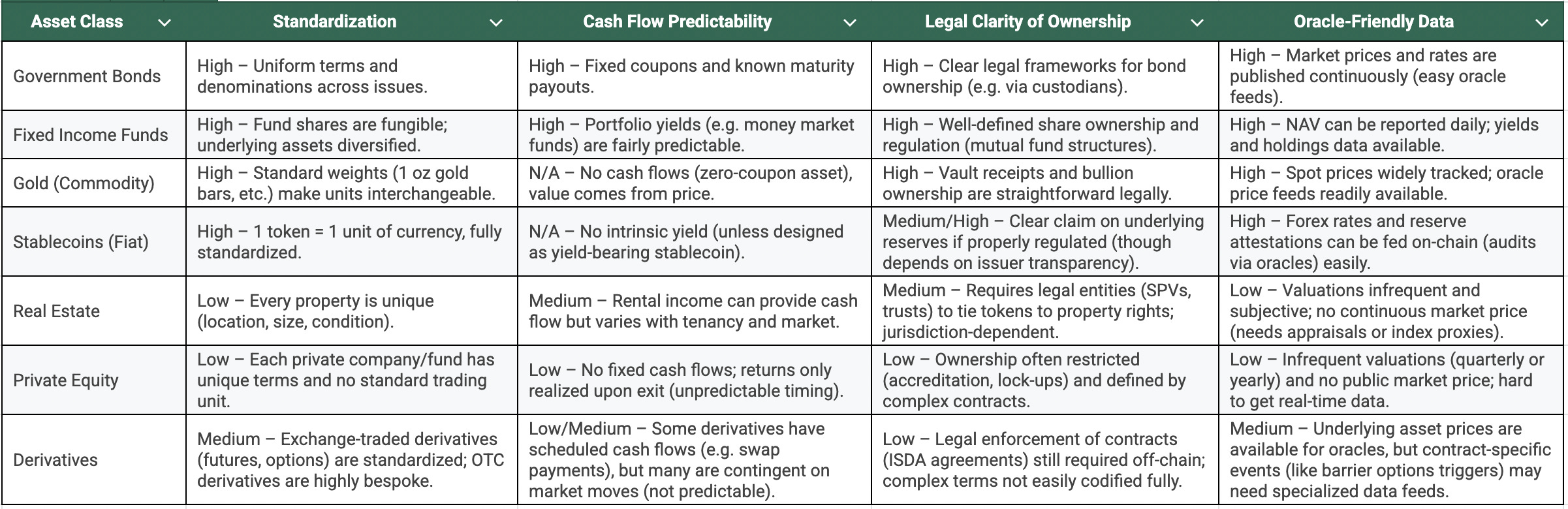 As we can see, assets with simple, well-defined structures (bonds, funds, commodities) check most of the boxes. They are fungible, produce either steady income or have transparent pricing, come with clear legal ownership, and can be easily interfaced with through oracles. This explains why these assets were among the first to be successfully tokenized on a meaningful scale. Meanwhile, assets that are unique, illiquid, or legally convoluted (real estate, private investments, bespoke derivatives) tend to score low on multiple dimensions, meaning extra friction to tokenize.